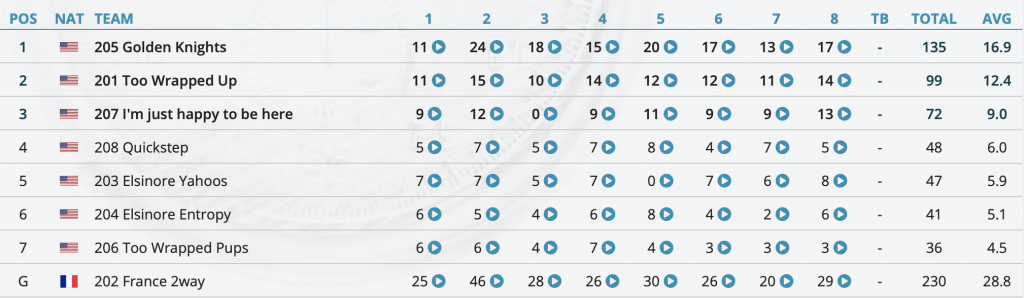 Bilan de la matinée après 4 manches : 14-11-12-12, ce qui est tout le même correct. Les autres équipes US scorent à 10 donc nous sommes nos premiers adversaires ! Il faut continuer à chercher le bon niveau d’activation qui nous permettra d’être plus précis et efficaces pour les 4 dernières manches.