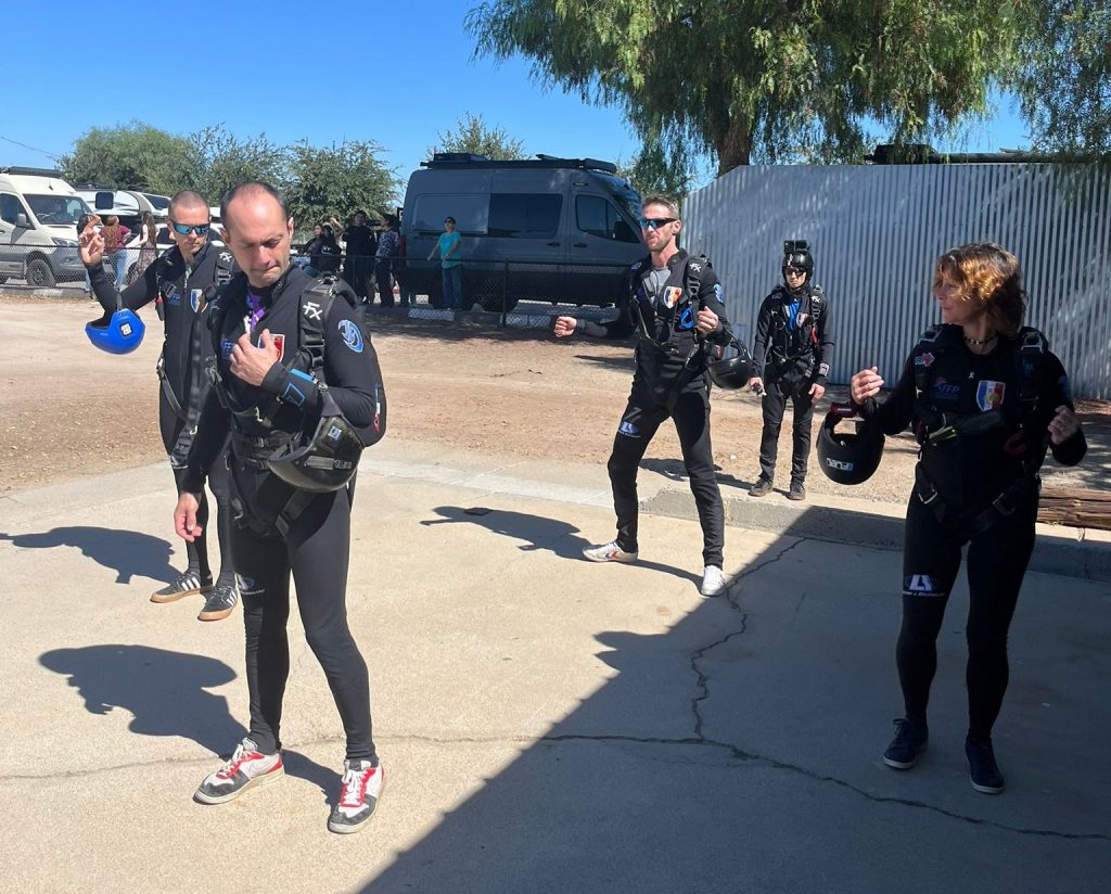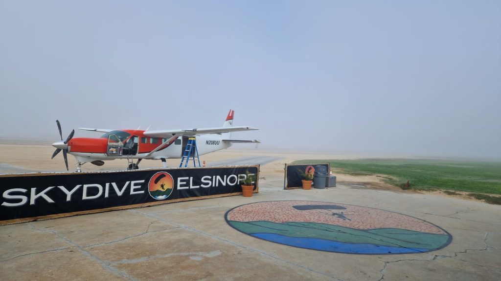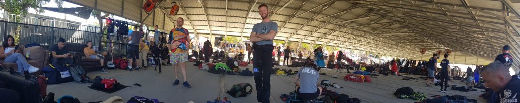 Le 5 octobre, tout le monde était levé aux aurores / aux horaires françaises (nous sommes à 9h de moins que la France), avec comme programme de la journée un programme type : petit dej, découverte de la DZ, paperasse administrative, check matos et autres signatures de waiver et de décharges typiques des dropzones US (avec en supplément une « déclaration » et signature filmée pour qu’ils soient certains que c’est bien nous qui signons et pas quelqu’un d’autre), puis 1 saut de mise en jambe pour chaque équipe.