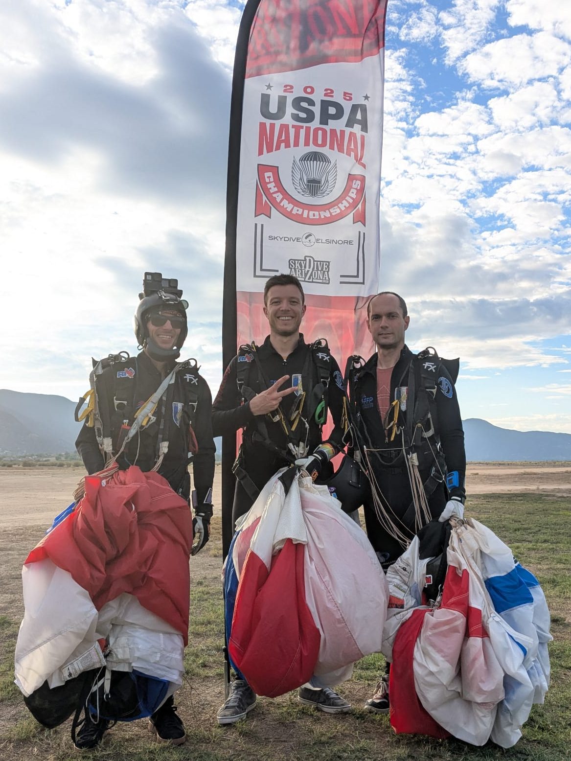 Peu après le poser du 1er saut, Steve, revenu de la maison pour apporter les chaussures de sauts d’un équipiers qui les avaient oubliées (on ne dira pas de nom :D), compte les points et annonce 11pts… L’équipe est un peu déçue, surtout compte tenu du bloc Diamant-Twostep qui est rapide et qui devrait scorer un peu plus… mais soit… Apres le pliage, l’équipe se rapproche du tableau des scores ou des équipes US nous félicitent … On demande pourquoi et ils répondent « congratulation for your 14 points! ». « Enduit » en erreur par un équipier, Steve avait compté 11pts sur 1min30 au lieu des 2 minutes. Outre cette petite blague, le saut manque quand même de précision et l’équipe est capable de faire le même nombre de points en plus propre et précis.